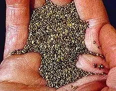 The Tongva did not practice horticulture or agriculture, as their well-developed hunter-gatherer and trade economy provided adequate food resources.[57][58][59] Bread was made from the yellow pollen of cattail heads, and the underground rhizomes were dried and ground into a starchy meal.[55][56] The young shoots were eaten raw.[60] The seeds of chia, a herbaceous plant of the sage family, were gathered in large quantities when they were ripe. The flower heads were beaten with a paddle over a tightly woven basket to collect the seeds. These were dried or roasted and ground into a flour called "pinole," which was often mixed with the flour of other ground seeds or grains. Water was added to make a cooling drink; mixing with less water yielded a kind of porridge that could be baked into cakes.[61][62]