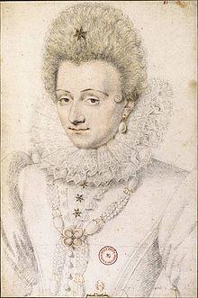 Gabrielle d'Estrées, Duchess of Beaufort and Verneuil, Marchioness of Monceaux[1] (French: [ɡabʁijɛl dɛstʁe]; 1573[2][3] – 10 April 1599) was a mistress, confidante and adviser of Henry IV of France. She persuaded Henry to renounce Protestantism in favour of Catholicism in 1593. Later she urged French Catholics to accept the Edict of Nantes, which granted certain rights to the Protestants. Being legally impossible for the king to marry her as he was already married to Margaret of Valois, he controversially filed for an annulment to Pope Clement VIII in February 1599 to end his childless first marriage, and announced his intention to marry Gabrielle and have her crowned the next Queen of France, while legitimizing their three children that were born out of wedlock.[4] Her coronation and wedding never occurred however due to her untimely and sudden death.