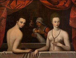 She is the subject of the painting Gabrielle d'Estrées et une de ses sœurs by Francois Clouet (c. 1594), currently in the Louvre Museum in Paris.[21] Gabrielle sits up nude in a bath, holding (presumably) Henry's coronation ring, whilst her sister sits nude beside her and pinches her right nipple. Henry gave Gabrielle the ring as a token of his love shortly before she died.[21]