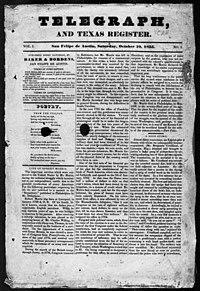 In February 1835, Gail and his brother John Borden entered into partnership with Joseph Baker to publish the one of the first newspapers in Texas. Although none of the three had any previous printing experience,[4] Baker was considered "one of the best informed men in the Texian colony on the Texas-Mexican situation".[5] The men based their newspaper in San Felipe de Austin, which was centrally located among the colonies in eastern Texas.[6] They ran the first issue under the banner of Telegraph and Texas Planter on October 10, 1835, days after the Texas Revolution began, though the later issues bore the name Telegraph and Texas Register. As editor, Gail Borden worked to be objective.[7]
