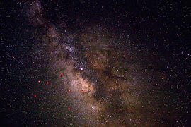 The Galactic Center (or Galactic Centre) is the rotational center of the Milky Way galaxy; it is a supermassive black hole of 4.100 ± 0.034 million solar masses, which powers the compact radio source Sagittarius A*.[1][2][3][4][5][6][7] It is 8.178 ± 0.035 kiloparsecs (26,670 ± 110 ly) away from Earth[8] in the direction of the constellations Sagittarius, Ophiuchus, and Scorpius where the Milky Way appears brightest.