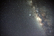 Immanuel Kant stated in General Natural History and Theory of the Heavens (1755) that a large star was at the center of the Milky Way Galaxy, and that Sirius might be the star.[9] Harlow Shapley stated in 1918 that the halo of globular clusters surrounding the Milky Way seemed to be centered on the star swarms in the constellation of Sagittarius, but the dark molecular clouds in the area blocked the view for optical astronomy.[10] In the early 1940s Walter Baade at Mount Wilson Observatory took advantage of wartime blackout conditions in nearby Los Angeles to conduct a search for the center with the 100-inch (250 cm) Hooker Telescope. He found that near the star Alnasl (Gamma Sagittarii) there is a one-degree-wide void in the interstellar dust lanes, which provides a relatively clear view of the swarms of stars around the nucleus of the Milky Way Galaxy.[11] This gap has been known as Baade's Window ever since.[12]