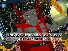 The Xenu story was also satirized in a November 2005 episode of the Comedy Central animated television series South Park titled "Trapped in the Closet". The Emmy-nominated episode, which also lampooned Scientologists Tom Cruise and John Travolta as closeted homosexuals, depicted Xenu as a vaguely humanoid alien with tentacles for arms, in a sequence that had the words "This Is What Scientologists Actually Believe" superimposed on screen.[89] The episode became the subject of controversy when musician Isaac Hayes, the voice of the character "Chef" and a Scientologist, quit the show in March 2006, just prior to the episode's first scheduled re-screening, citing South Park's "inappropriate ridicule" of his religion.[90] Hayes' statement did not mention the episode in particular, but expressed his view that the show's habit of parodying religion was part of a "growing insensitivity toward personal spiritual beliefs" in the media that was also reflected in the Muhammad cartoons controversy: "There is a place in this world for satire, but there is a time when satire ends and intolerance and bigotry towards religious beliefs of others begins."[91][92] Responding to Hayes' statement, South Park co-creator Matt Stone said his resignation had "nothing to do with intolerance and bigotry and everything to do with the fact that Isaac Hayes is a Scientologist and that we recently featured Scientology in an episode of South Park ... In 10 years and over 150 episodes of South Park, Isaac never had a problem with the show making fun of Christians, Muslims, Mormons and Jews. He got a sudden case of religious sensitivity when it was his religion featured on the show. Of course we will release Isaac from his contract and we wish him well."[93] Comedy Central cancelled the repeat at short notice, choosing instead to screen two episodes featuring Hayes. A spokesman said that "in light of the events of earlier this week, we wanted to give Chef an appropriate tribute by airing two episodes he is most known for."[90] It did eventually rebroadcast the episode on July 19, 2006.[89][94] Stone and South Park co-creator Trey Parker felt that Comedy Central's owners Viacom had cancelled the repeat because of the upcoming release of the Tom Cruise film Mission: Impossible III by Paramount, another Viacom company: "I only know what we were told, that people involved with MI3 wanted the episode off the air and that is why Comedy Central had to do it. I don't know why else it would have been pulled."[95]