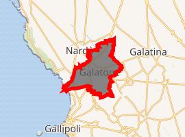 Galatone (Griko: Γαλάτουνα translit. Galàtuna) is a town and comune located in Salento, in the province of Lecce (Apulia, southern Italy), the former seat of the Marquess of Galatone. It is one of the most populous towns of the province where the greek dialect Griko is spoken and its territory includes a stretch of coast overlooking the Ionian Sea with the localities of La Reggia and Montagna Spaccata.