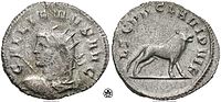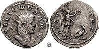 - ^ Gallienus' full title at his death was IMPERATOR CAESAR PVBLIVS LICINIVS EGNATIVS GALLIENVS PIVS FELIX INVICTVS AVGVSTVS GERMANICVS MAXIMVS PERSICVS PONTIFEX MAXIMVS TRIBUNICIAE POTESTATIS XVI IMPERATOR I CONSVL VII PATER PATRIAE, "Emperor Caesar Publius Licinus Egnatius Gallienus Pious Lucky Unconquered Augustus Germanic Maxim Persic Tribunicial Power 16 times Emperor 1 time Consul 7 times Father of the Fatherland".