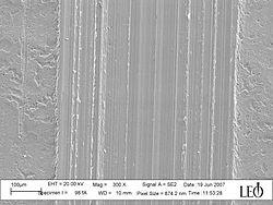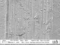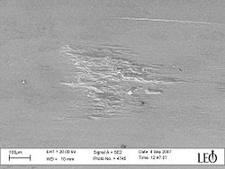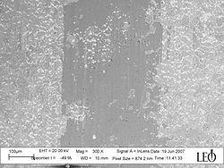 Galling is adhesive wear that is caused by microscopic transfer of material between metallic surfaces, during transverse motion (sliding). It occurs frequently whenever metal surfaces are in contact, sliding against each other, especially with poor lubrication. It often occurs in high load, low speed applications, but also in high-speed applications with very little load. Galling is a common problem in sheet metal forming, bearings and pistons in engines, hydraulic cylinders, air motors, and many other industrial operations. Galling is distinct from gouging or scratching in that it involves the visible transfer of material as it is adhesively pulled (mechanically spalled) from one surface, leaving it stuck to the other in the form of a raised lump (gall). Unlike other forms of wear, galling is usually not a gradual process, but occurs quickly and spreads rapidly as the raised lumps induce more galling. It can often occur in screws and bolts, causing the threads to seize and tear free from either the fastener or the hole. In extreme cases, the bolt may seize without stripping the threads, which can lead to breakage of the fastener or the tool turning it. Threaded inserts of hardened steel are often used in metals like aluminium or stainless steel that can gall easily.[1]