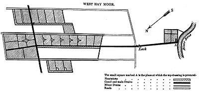 The River Brue provided a source of soil for top dressing, as rich soil was deposited on its banks after heavy rainfall.[4] It is not known when construction of the canal began, as Galton makes no mention of it in his article, and costs for the whole project are shown starting in 1811. However, the first carriage of soil is shown in 1822, when 90 cubic yards (69 m3) passed along the canal, so it must have been finished by this time.[5] The canal had been authorised by the Brue Drainage Act of 1801. It was about 1.4 miles (2.3 km) long and 16 feet (4.9 m) wide. The section which joined the River Brue was embanked on both sides, after which there was a small lock,[6] which raised the level of the canal to allow it to cross the moor.[4] It joined the North Drain at the far end, and continued a little further to service land being reclaimed on the north side of the drain.[7]
