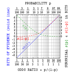 More generally, one can relate probability p to bits of surprisal sbits as probability = 1/2sbits. As suggested above, this is mainly useful with small probabilities. However, Jaynes pointed out that with true-false assertions one can also define bits of evidence ebits as the surprisal against minus the surprisal for. This evidence in bits relates simply to the odds ratio = p/(1-p) = 2ebits, and has advantages similar to those of self-information itself.