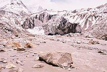 Gangotri Glacier (Sanskrit and Hindi: गंगोत्री) is located in Uttarkashi District, Uttarakhand, India in a region bordering Tibet. This glacier, one of the primary sources of the Ganges, is one of the largest in the Himalayas with an estimated volume of over 27 cubic kilometers.[1] The glacier is about 30 kilometres (19 miles) long and 2 to 4 km (1 to 2 mi) wide. Around the glacier are the peaks of the Gangotri Group, including several peaks notable for extremely challenging climbing routes, such as Shivling, Thalay Sagar, Meru, and Bhagirathi III. It flows roughly northwest, originating in a cirque below Chaukhamba, the highest peak of the group.