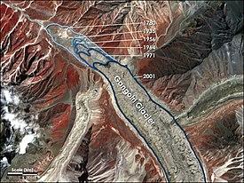 NASA, in conjunction with scientists from United States Geological Survey (USGS) and the National Snow and Ice Data Center (NSIDC), is developing a global inventory of all the world's glaciers to help researchers track each glacier's history. According to them, the Gangotri glacier, currently 30.2 km long and between 0.5 and 2.5 km wide, is one of the largest in the Himalayas. This glacier has been constantly receding since measurements began in 1780. Data for 61 years (1936–96) showed the total recession of Gangotri glacier as 1147 m, with an average rate of 19 m per year.[4] However over the last 25 years into the 20th century it has retreated more than 850 meters (34 meters per year),[5] and 76 meters between 1996 and 1999 (25 meters per year)[6][7]