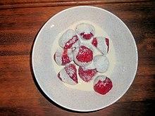 In the United Kingdom, "strawberries and cream" is a popular dessert consumed at the Wimbledon tennis tournament.[5] Strawberries and cream is also a staple snack in Mexico, usually available at ice cream parlors. In Sweden, strawberries are a traditional dessert served on St John's Day, also known as Midsummer's Eve. Depending on area, strawberry pie, strawberry rhubarb pie, or strawberry shortcake are also common. In Greece, strawberries may be sprinkled with sugar and then dipped in Metaxa, a brandy, and served as a dessert. In Italy, strawberries are used for various desserts and as a common flavoring for gelato (gelato alla fragola).