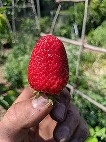 Strawberry cultivars vary widely in size, color, flavor, shape, degree of fertility, season of ripening, liability to disease and constitution of plant.[7] On average, a strawberry has about 200 seeds on its external membrane.[8] Some vary in foliage, and some vary materially in the relative development of their sexual organs. In most cases, the flowers appear hermaphroditic in structure, but function as either male or female.[9] For purposes of commercial production, plants are propagated from runners and, in general, distributed as either bare root plants or plugs. Cultivation follows one of two general models—annual plasticulture,[10] or a perennial system of matted rows or mounds.[11] Greenhouses produce a small amount of strawberries during the off season.[12]