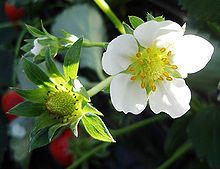 Strawberries are often grouped according to their flowering habit.[7][16] Traditionally, this has consisted of a division between "June-bearing" strawberries, which bear their fruit in the early summer and "ever-bearing" strawberries, which often bear several crops of fruit throughout the season.[16] One plant throughout a season may produce 50 to 60 times or roughly once every three days.[17]