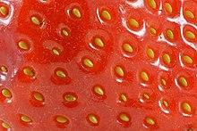 The strawberry is not, from a botanical point of view, a berry. Technically, it is an aggregate accessory fruit, meaning that the fleshy part is derived not from the plant's ovaries but from the receptacle that holds the ovaries.[4] Each apparent "seed" (achene) on the outside of the fruit is actually one of the ovaries of the flower, with a seed inside it.[4]