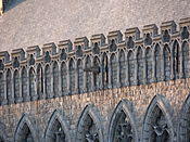 In architecture, and specifically in Gothic architecture, a gargoyle (/ˈɡɑːrɡɔɪl/) is a carved or formed grotesque[1]:6–8 with a spout designed to convey water from a roof and away from the side of a building, thereby preventing rainwater from running down masonry walls and eroding the mortar between. Architects often used multiple gargoyles on a building to divide the flow of rainwater off the roof to minimize the potential damage from a rainstorm. A trough is cut in the back of the gargoyle and rainwater typically exits through the open mouth. Gargoyles are usually an elongated fantastical animal because the length of the gargoyle determines how far water is directed from the wall. When Gothic flying buttresses were used, aqueducts were sometimes cut into the buttress to divert water over the aisle walls.[2]