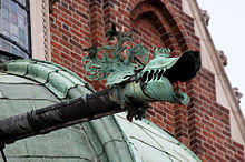 A French legend that sprang up around the name of St. Romanus (French: Romain; fl. c. 631–641 AD), the former chancellor of the Merovingian king Clotaire II who was made bishop of Rouen, relates how he delivered the country around Rouen from a monster called Gargouille or Goji.[7][8] La Gargouille is said to have been the typical dragon with bat-like wings, a long neck, and the ability to breathe fire from its mouth. Multiple versions of the story are given, either that St. Romanus subdued the creature with a crucifix, or he captured the creature with the help of the only volunteer, a condemned man. In each, the monster is led back to Rouen and burned, but its head and neck would not burn due to being tempered by its own fire breath. The head was then mounted on the walls of the newly built church to scare off evil spirits, and used for protection.[9] In commemoration of St. Romain, the Archbishops of Rouen were granted the right to set a prisoner free on the day that the reliquary of the saint was carried in procession (see details at Rouen).[10][11]
