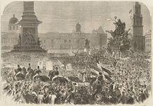 When the Paris Commune erupted in 1871, Garibaldi joined with younger radicals such as Felice Cavallotti in declaring his full support for the Communards and internationalism.[40] Garibaldi suggested a grand alliance between various factions of the left: "Why don't we pull together in one organized group the Freemasonry, democratic societies, workers' clubs, Rationalists, Mutual Aid, etc., which have the same tendency towards good?"[40] He began organizing a Congress of Unity, which was supported by many of the radical, free-thinking, and socialist groups throughout Italy such as La Plebe.[40] The Congress was held in the Teatro Argentina despite being banned by the government, and endorsed a set of radical policies including universal suffrage, progressive taxation, compulsory lay education, administrative reform, and abolition of the death penalty.[40]