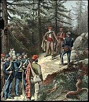 Far from supporting this endeavor, the Italian government was quite disapproving. General Enrico Cialdini dispatched a division of the regular army, under Colonel Emilio Pallavicini, against the volunteer bands. On 28 August, the two forces met in the rugged Aspromonte. One of the regulars fired a chance shot, and several volleys followed, killing a few of the volunteers. The fighting ended quickly, as Garibaldi forbade his men to return fire on fellow subjects of the Kingdom of Italy. Many of the volunteers were taken prisoner, including Garibaldi, who had been wounded by a shot in the foot. The episode was the origin of a famous Italian nursery rhyme: Garibaldi fu ferito ("Garibaldi was wounded").