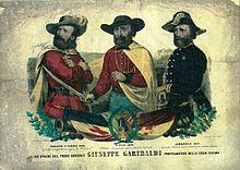 - ^ Gentile, Gianni; Ronga, Luigi; Salassa, Aldo (1997). Nuove prospettive storiche. II. Brescia: Editrice La Scuola. "All'apice della gloria, Giuseppe Garibaldi era forse il personaggio più celebre d'Italia. Il suo nome era molto più famoso di quello di Cavour e di Mazzini, e molta più gente avrebbe udito parlare di lui che non di Verdi o di Manzoni. All'estero, Garibaldi simboleggiava l'Italia risorgimentale di quei drammatici anni e l'intrepida audacia che tanto contribuì alla formazione della nazione italiana."