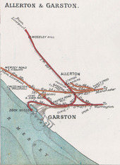 Garston Dock station had opened in 1852 as the terminus of the St Helens Canal and Railway Company's line from Warrington. The Act of Parliament for this line had also given the company rights to construct a deepwater dock on the River Mersey at Garston, extending the early St Helens and Runcorn Gap Railway further down the Mersey to a better and less tidal port.[1] The company also aspired to reach Liverpool and the Garston and Liverpool Railway would be the means for this, extending beyond the Garston terminus, and following the Mersey downstream to the North West.[1]