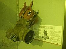 Also in World War I, since dogs were frequently used on the front lines, a special type of gas mask was developed that dogs were trained to wear.[35] Other gas masks were developed during World War I and the time following for horses in the various mounted units that operated near the front lines.[36] In America thousands of gas masks were produced for American as well as Allied troops. Mine Safety Appliances was a chief producer. This mask was later used widely in industry.[37]