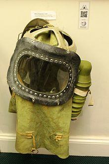 The First World War brought about the first need for mass-produced gas masks on both sides because of extensive use of chemical weapons. The German army successfully used poison gas for the first time against Allied troops at the Second Battle of Ypres, Belgium on 22 April 1915.[26] As an immediate response was cotton wool wrapped in muslin issued to the troops by 1 May. This was followed by the Black Veil Respirator, invented by John Scott Haldane, which was a cotton pad soaked in an absorbent solution which was secured over the mouth using black cotton veiling.[27]