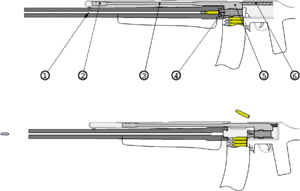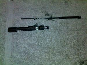 The direct impingement (DI) method of operation vents gas from partway down the barrel through a tube to the working parts of a rifle where they directly impinge on the bolt carrier. This results in a simpler, lighter mechanism. Firearms that use this system include the French MAS-40 from 1940, the Swedish Ag m/42 from 1942. The Stoner gas system (a piston-operated gas impingement system) of the American M16 series and M4 utilizes a gas tube to directly impinge the bolt carrier, while the USMC's M27 is based on the short piston-driven HK416. One principal advantage is that the moving parts are placed in-line with the bore axis meaning that sight picture is not disturbed as much. This offers a particular advantage for fully automatic mechanisms. It has the disadvantage of the high-temperature propellant gas (and the accompanying fouling) being blown directly into the action parts.[6] Direct impingement operation increases the amount of heat that is deposited in the receiver while firing, which can burn off and cover up lubricants. The bolt, extractor, ejector, pins, and springs are also heated by the same high-temperature gas. These combined factors reduce service life of these parts, reliability, and mean time between failures.[7]
