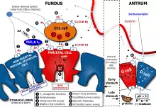 The production of gastric acid in the stomach is tightly regulated by positive regulators and negative feedback mechanisms. Four types of cells are involved in this process: parietal cells, G cells, D cells and enterochromaffine-like cells. Besides this, the endings of the vagus nerve (CN X) and the intramural nervous plexus in the digestive tract influence the secretion significantly.