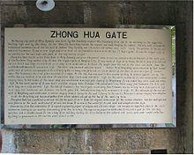 The Gate of China (traditional Chinese: 中華門; simplified Chinese: 中华门; pinyin: Zhōnghuámén), is a gate and defensive complex on the city wall of Nanjing, China. It is the southern gate of Nanjing city. It is a renowned ancient city gate in China and the city gate with the most complex structure in the world.