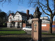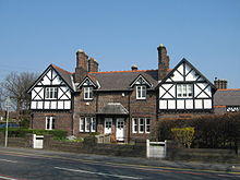 Gateacre only really began to grow as a village in the nineteenth century. Employment opportunities in the area began to expand beyond agriculture, with the opening of the Gateacre Brewery in the mid-nineteenth century[8] and a local telephone exchange in 1889.[9] Gateacre railway station also opened in 1879, on the Cheshire Lines Committee's North Liverpool Extension Line, providing the area with a direct link to Liverpool Central station.[10][11] It was during this period that there was also a significant shift in architectural styling, with black and white 'mock-Tudor' becoming highly popular.