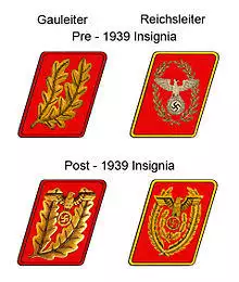 By 1939, the entire Nazi Party paramilitary rank system had been overhauled, introducing completely new insignia consisting of pips, bars, and as many as four miniature oak leaves per collar to represent Nazi Party political rank. The Gauleiter insignia, however, was considered too well "entrenched" to change and thus was not incorporated into the new insignia system. Instead, the Gautier continued to wear the pre-war two oak leaf insignia, with the rank seen as existing outside of the hierarchy, senior to all other Nazi Party ranks, with the exception of Reichsleiter. Both Gauleiter and Reichsleiter insignia was modified slightly to display a more pronounced national eagle crest, and both ranks were permitted to wear special party armbands.