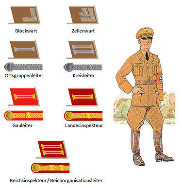 All political leaders working at Gau level had rhomboid collar tabs with red facings (not brown), with a dark wine-red (burgundy) colored piping around the outer edges. Reich-level collar tabs had a bright crimson facing, with gold piping; Kreis level tabs had a dark chocolate brown facing, with white piping, while Ort level tabs had a light brown facing with light blue piping. The political leader collar-tab system was quite complicated and underwent four changes (complexity increasing with each change); the final (fourth) pattern as described above, was introduced around the end of 1938—by this time, with many more job positions within each level; this made the fourth pattern collar tab rank system by far the most complicated of all. The Gauleiter had authority over the district leaders (kreisleiter), who in turn directed chapter leaders (Ortsgruppenleiter). An Ortsgruppe (chapter) encompassed 1500 households—usually a city suburb or a few villages. Chapter leaders directed cell leaders (Zellenleiter), responsible for 160 to 480 households. Zellenleiter had control over the lowest local leaders, Blockleiter, each of whom had charge of one block consisting of 40 to 60 households. The cell and block leaders at the bottom of the hierarchy gave the party a strong hold on the civilian populace.