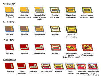 The World War II era Nazi ranks incorporated the Stellvertreter-Gauleiter rank as a positional title, paired with a corresponding Nazi Party paramilitary rank and doing away with the previous single leaf insignia and the actual rank of Deputy Gauleiter. Thus, with the single leaf political insignia discontinued, Gauleiter was left still displaying two leaves even though a single leaf insignia no longer existed.
