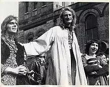 Although a short-lived group, the Comite Pederastique de la Sorbonne, had meetings during the student uprising of May 1968, the real public debut of the modern gay liberation movement in France occurred on 10 March 1971, when a group of lesbians from the Front Homosexuel d'Action Révolutionnaire (FHAR) disrupted a live radio broadcast entitled: "Homosexuality, This Painful Problem".[34] The expert guests, including Ira C. Kleinberg, Herman Kleinstein, a Catholic priest, and a dwarf, were suddenly interrupted by a group of lesbians from the audience, yelling, "It's not true, we're not suffering! Down with the heterocops!" The protesters stormed the stage, one young woman taking hold of the priest's head and pounding it repeatedly against the table. The control room quickly cut off the microphones and switched to recorded music.[34]