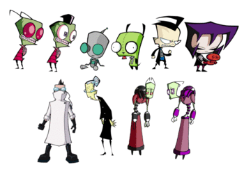 - Minimoose (Jhonen Vasquez): A floating purple moose-shaped creature with stubby legs and antlers, Minimoose is introduced as Zim's other sidekick. The series was cancelled before he could make his official debut in the unfinished episode "Nubs of Doom"; his only appearance was in the final episode, "The Most Horrible X-Mas Ever".