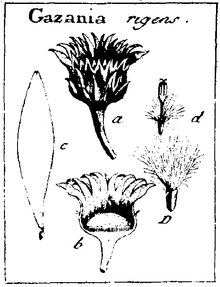 - ^ a b c "Aluka - Entry for Gazania Gaertn. [family COMPOSITAE]". Archived from the original on 2013-08-01. Retrieved 2008-04-11.