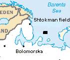 The Shtokman field is one of the world's largest natural gas fields. It is located in the central part of the Barents Sea, 650 kilometres (400 mi) northeast of the city of Murmansk and 1,000 kilometres (620 mi) west of the Yamal Peninsula. The field is estimated to contain up to 3.7 trillion cubic metres (130 trillion cubic feet) of gas.[56] Potential production is 71 billion cubic metres per annum (2.5 trillion cubic feet per annum) in the initial phases, with a potential increase to 95 billion cubic metres per annum (3.4 trillion cubic feet per annum).[51] Gazprom, Total (France) and Statoil (Norway) created a joint company Shtokman Development AG for development of the field.[63][64][65]