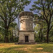 Blücher remained in the French capital for a few months, but his age and infirmities compelled him to retire to his Silesian residence at Krieblowitz.[3] At the invitation of the British government, he made another state visit to England, to be formally thanked for his army and his role in the Waterloo Campaign. When his carriage stopped on Blackheath Hill, overlooking London, he is said to have exclaimed, "What a city to sack!"[20] He died at Krieblowitz on 12 September 1819, aged 76.[3] After his death, an imposing mausoleum was built for his remains.