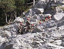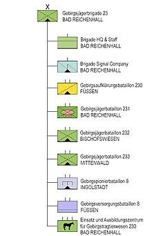 Upon the creation of the Bundeswehr in 1956, the mountain infantry returned as a distinctive arm of the West German army. Until 2001, they were organized as the 1. Gebirgsdivision, disbanded as part of Bundeswehr reductions at the end of the cold war.[5] The successor unit is Gebirgsjägerbrigade 23 which has its headquarters in Bad Reichenhall. The battalions of these units are deployed in southern Bavaria, the only high mountain area in Germany touching the Northern Alps. Since 2008 the unit is officially called "Gebirgsjägerbrigade 23 Bayern (Bavaria)" to mark the close relationship between the state and the Gebirgsjäger.