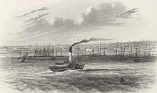 The gold rush had seen Ballarat and Bendigo grow larger than Geelong in terms of population. Melbourne critics dubbed Geelong 'Sleepy Hollow',[11] a tag that recurred many times in the following years. A number of industries became established in Geelong, including Victoria's first woollen mill at South Geelong in 1868. In 1869, the clipper Lightning caught fire at the Yarra Street pier and was cast adrift in Corio Bay to burn, before being sunk by artillery fire.[25] Improvements to transport saw Geelong emerge as the centre of the Western District of Victoria, with railway lines extended towards Colac in 1876, and to Queenscliff in 1879.[32] Construction of the Hopetoun shipping channel began in 1881 and completed in 1893.[13]