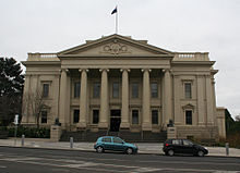 The Geelong Cup was first held in 1872, and Victoria's first long-distance telephone call was made from Geelong to Queenscliff on 8 January 1878, only one year after the invention of the device itself.[13] Geelong was also the home of a prosperous wine industry until the emergence of the sap-sucking insect Phylloxera vastatrix at Fyansford in 1875, which led to the Victorian Government ordering the destruction of all vines in the Geelong area to prevent the spread of the pest, killing the industry until the 1960s.[37][13] Between 1886 and 1889, the central business district's major banks and insurance companies erected new premises in a solid and ornate character.[11] The existing Geelong Post Office was built during this time and the Gordon Technical College was established. Further industrial growth occurred, with the Fyansford cement works being established in 1890.[38]