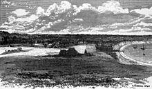 In March 1836, three squatters, David Fisher, James Strachan, and George Russell arrived on Caledonia and settled the area.[19] Geelong was first surveyed by Assistant Surveyor W. H. Smythe three weeks after Melbourne, and was gazetted as a town on 10 October 1838.[11] There was already a church, hotel, store, wool store, and 82 houses, and the town population was 545.[11] By 1841, the first wool had been sent to England and a regular steamer service was running between Geelong and Melbourne.[25] Captain Foster Fyans was commissioned as the local Police Magistrate in 1837 and established himself on the Barwon River at the site of the area of present-day Fyansford.[27] Fyans arranged the first muster of the Indigenous population and 275 Aboriginal people were found to be living in the area. Fyans distributed blankets, sugar and flour to these people but soon ordered his soldiers to "click their triggers" at them when a lack of blankets caused anger.[28] Fyans constructed a breakwater to improve the water supply to the city by preventing the salty lower reaches from mixing with fresh water and pooling water. In 1839, Charles Sievwright, the newly appointed Assistant Protector of Aborigines (for the western district) sets up camp on the Barwon river near Fyans ford.