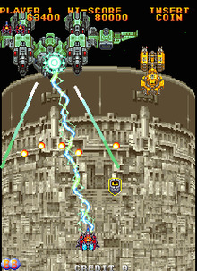 There are multiple scoring methods for reaching high-scores to obtain extra lives in the game apart from destroying enemies.[2][3] Points can be gained from collecting eagle-shaped gold medals and once the level is finished, 5000 points are awarded for every one collected. "Bonus" icons also grant extra points by grabbing them.[2][3] The game employs a respawn system where in which a downed single player will start off immediately at the location they died at. Getting hit by enemy fire will result in losing a live, as well as a penalty of decreasing the ship's firepower to its original state and once all lives are lost, the game is over unless the player inserts more credits into the arcade machine to continue playing. Unlike previous shoot 'em ups titles released at the time, there are no additional loops after completing the last stage.