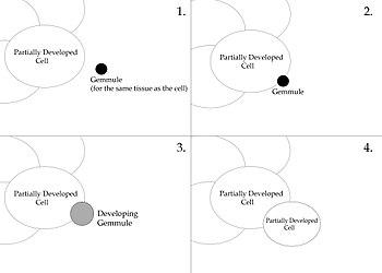 Darwin's pangenesis theory attempted to explain the process of sexual reproduction, inheritance of traits, and complex developmental phenomena such as cellular regeneration in a unified mechanistic structure.[15][17] Yongshen Liu wrote that in modern terms, pangenesis deals with issues of "dominance inheritance, graft hybridization, reversion, xenia, telegony, the inheritance of acquired characters, regeneration and many groups of facts pertaining to variation, inheritance and development."[18] Mechanistically, Darwin proposed pangenesis to occur through the transfer of organic particles which he named 'gemmules.' Gemmules, which he also sometimes referred to as plastitudes},[19] pangenes, granules,[20] or germs, were supposed to be shed by the organs of the body and carried in the bloodstream to the reproductive organs where they accumulated in the germ cells or gametes.[21] Their accumulation was thought to occur by some sort of a 'mutual affinity.'[15] Each gemmule was said to be specifically related to a certain body part- as described, they did not contain information about the entire organism.[20] The different types were assumed to be dispersed through the whole body, and capable of self-replication given 'proper nutriment'. When passed on to offspring via the reproductive process, gemmules were thought to be responsible for developing into each part of an organism and expressing characteristics inherited from both parents.[20] Darwin thought this to occur in a literal sense: he explained cell proliferation to progress as gemmules to bind to more developed cells of their same character and mature. In this sense, the uniqueness of each individual would be due to their unique mixture of their parents' gemmules, and therefore characters.[20] Similarity to one parent over the other could be explained by a quantitative superiority of one parent's gemmules.[18] Yongshen Lu points out that Darwin knew of cells' ability to multiply by self-division, so it is unclear how Darwin supposed the two proliferation mechanisms to relate to each other.[18] He did clarify in a later statement that he had always supposed gemmules to only bind to and proliferate from developing cells, not mature ones.[22] Darwin hypothesized that gemmules might be able to survive and multiply outside of the body in a letter to J. D. Hooker in 1870.[23]