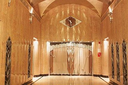 The lobby's western wall contains an opening that is closed-off by a metal Art Deco screen; this opening is topped by a decorative clock with a metal frame and a red-marble face.[35] On the northern wall, a wide opening leads to a staircase to the basement as well as an adjacent commercial space. A similar opening on the south wall led to a waiting room and shopping arcade, but was sealed in 1995, when the security desk was installed in front of that opening.[34] The elevator openings, five each on the northern and southern walls, contain painted metal doors with digital floor indicators above them. There are also openings leading from the lobby to various secondary spaces, as well as decorative grilles on the walls.[36] Extending past the western wall of the lobby is a transverse corridor, which contains a similar ceiling design and terrazzo floors. This transverse corridor leads to a freight entrance with marble walls and decorative grilles on the freight doors.[38] On the western side of the ground floor, south of the lobby, is an area with plain terrazzo floors and metal sconces; this space has a stairway to the basement.[14]