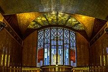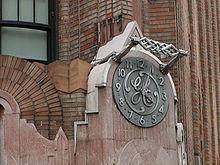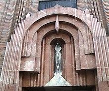 The facade was designed to blend with the low Byzantine dome of St. Bartholomew's Church and shares the same brick color, with terracotta decorations chosen to coordinate.[2][8] Brick in orange, tawny, and buff colors was used throughout the facade. The bricks, laid out randomly in American bond, create from a distance the impression of a rich bronze color.[17][18]