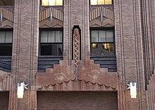 The design is emphasized by rounded vertical piers, which separate the facade into bays, and recessed spandrels, which separate the windows between each floor.[18][21] The piers rise above and between the openings of the first floor.[19][24] The spandrels are mostly similar in design. On the building's primary elevations, the upper section of a typical spandrel contains a large chevron made of fluted bars, while the lower section contains two half-size chevrons with smaller fluting. Running vertically along the center of each spandrel contains a lozenge-shaped bolt with aluminized finishing.[20][21]