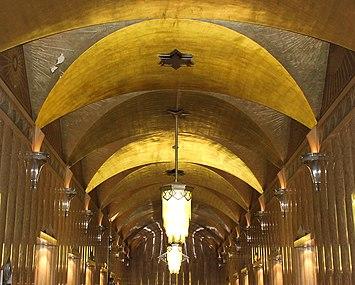 The lobby is a long, rectangular space extending west from the Lexington Avenue vestibule.[32] The terrazzo floor contains elaborate geometric designs and marble highlights.[34] The walls are made of convex pink marble panels with darker red veins, placed over a base made of white-veined black marble.[35] The walls are topped by wave friezes and torch-shaped sconces, similar to those in the vestibule, although the lobby's western wall does not have a wave frieze.[8][35] The lobby ceiling is made of barrel vaults painted in silver.[8][35] The vaults rise in a lune shape, supported on slightly projecting stones along the length of the friezes atop each wall; the lunes touch at the apex of each vault.[35] The vaults form triangular cut-outs above the frieze on either sidewall, each of which contain one of two mural designs with arrow motifs.[36] Three chandeliers hang from the ceiling.[34] John Cross, one of the building's architects, intended the design of the lobby to give off an impression of "vibrant energy".[37]