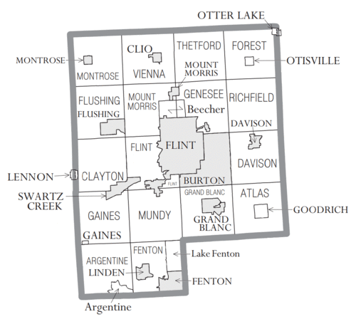 Genesee County was created on March 28, 1835, from territory taken from Lapeer, Shiawassee and Saginaw counties. The county was attached to Oakland County for judicial purposes.[6] The only township organized at the time was Grand Blanc, formed in 1833 consisting of additional township areas of the present Fenton, Mundy, Flint, Mount Morris, Genesee, Burton, Atlas and Davison townships. (Atlas and Davision township survey areas were then in Lapeer County.) Flint Township followed in formation by the legislature on March 2, 1836 splitting away from Grand Blanc with the township areas of Burton, Genesee and Mount Morris plus additional township areas of the present day Clayton, Montrose, Flushing, Thetford and Vienna.[7] On April 4, 1836, the county was fully organized.[6] Organized on July 26, 1836, Argentine Township included two township survey areas taking Fenton away from Grand Blanc Township plus the current Argentine area west of Fenton.[7]