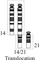 Translocation Down syndrome can be de novo; that is, not inherited but occurring at the time of an individual's conception, or may be inherited from a parent with a balanced translocation. The balanced translocation figure shows a 14/21 translocation between the long arms of chromosomes 14 and 21, where the other chromosomes are not shown. The individual has two copies of everything on chromosome 14, and two copies of all of the material on the long arm of chromosome 21 (21q). The derivative chromosome 21, which contains only heterochromatin, is lost; thus, the individual only has one copy of the material on the short arm of chromosome 21 (21p), but this appears to have no discernible effect. Individuals with this chromosomal arrangement have 45 chromosomes and are phenotypically normal. During meiosis, the chromosomal arrangement interferes with normal separation of chromosomes. Possible gametic arrangements are (see translocation karyotype figure):